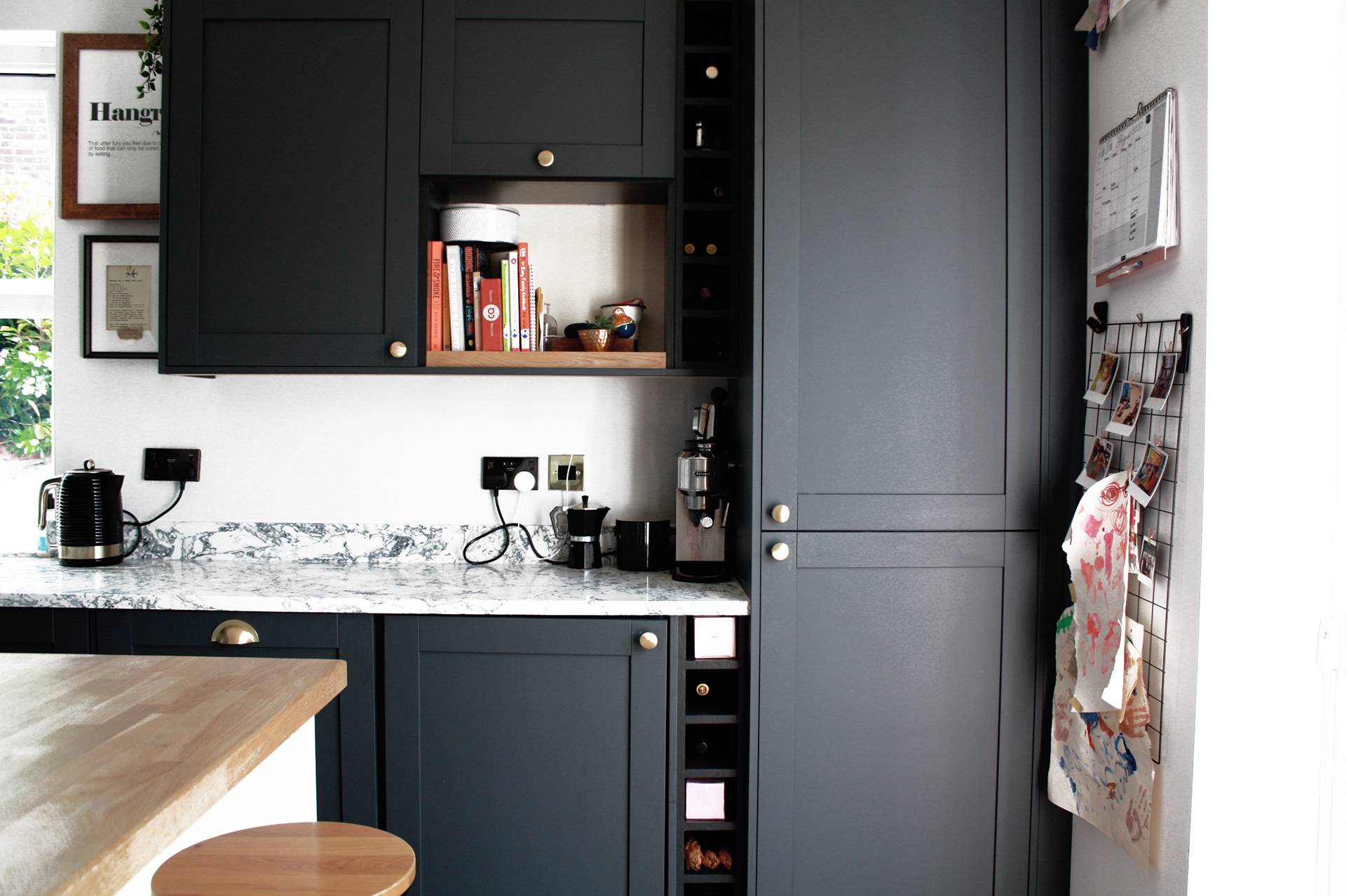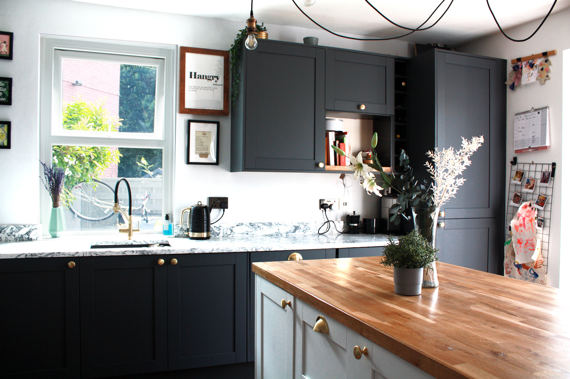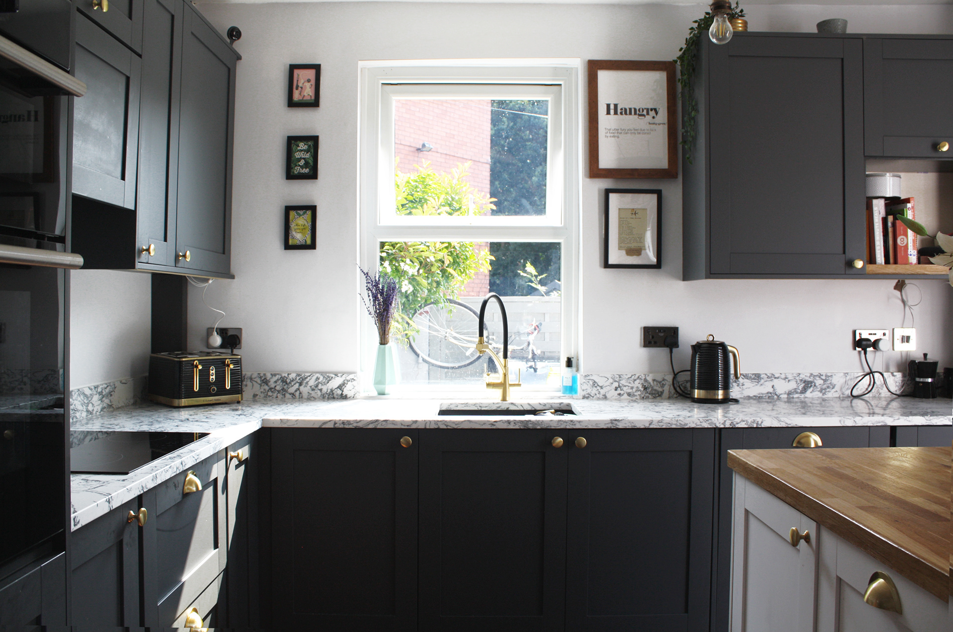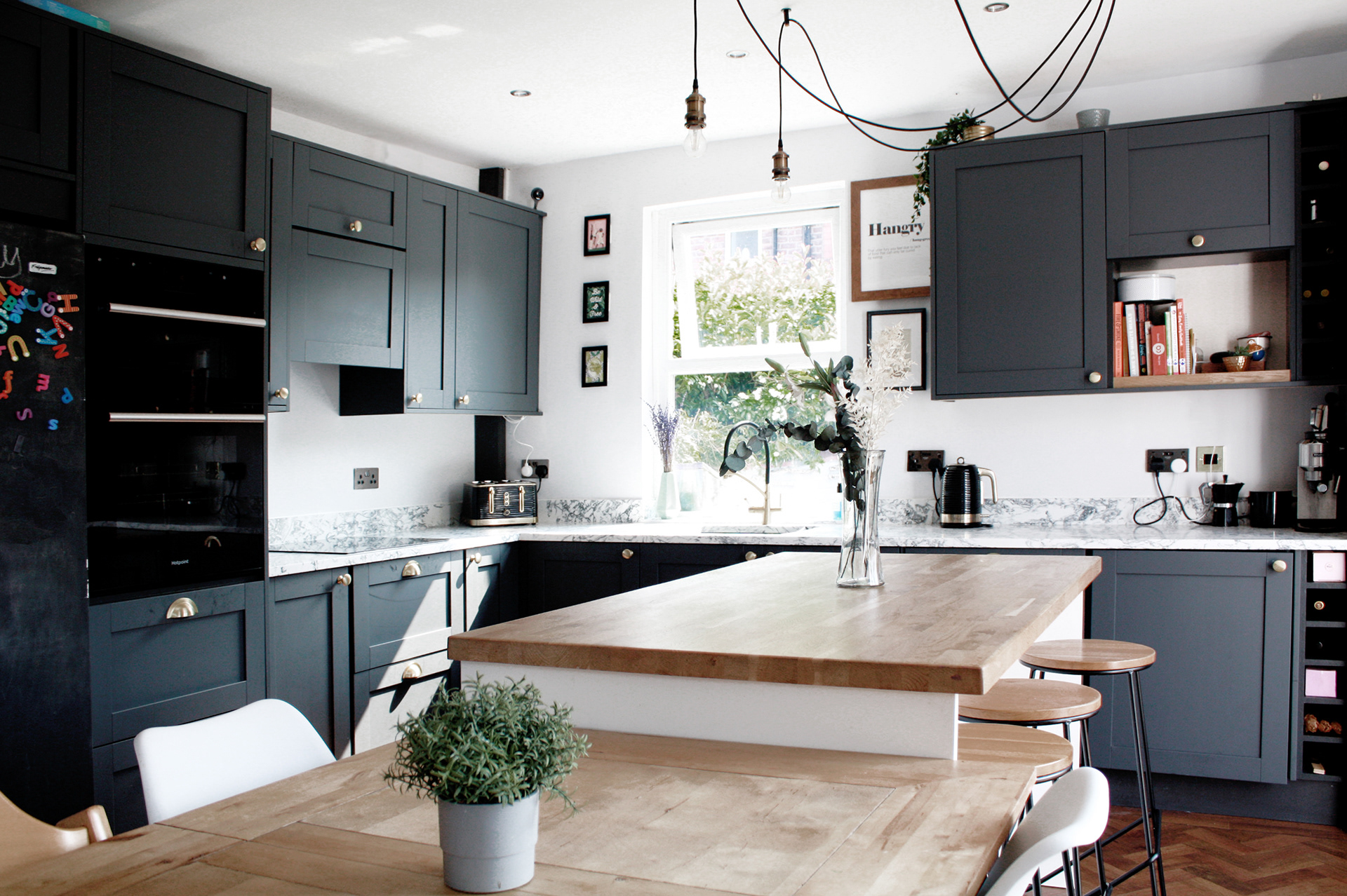Matt dark grey units, marble countertops, gold handles produce slick, stylish and modern kitchen. The tactile timber in the island and herringbone floor soften the grey. The spider pendant hung over the island is fully flexible and draws the eye through the space.