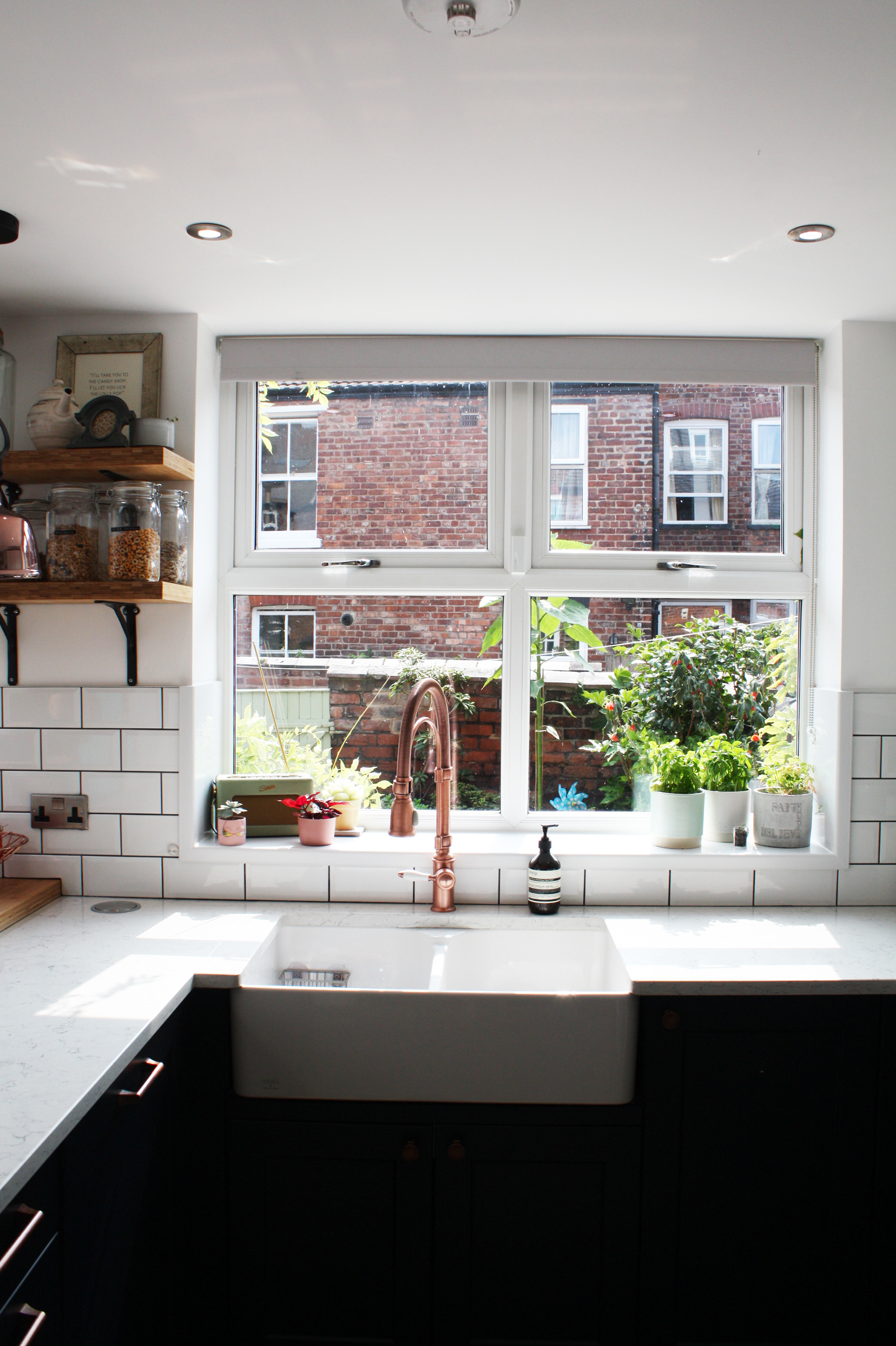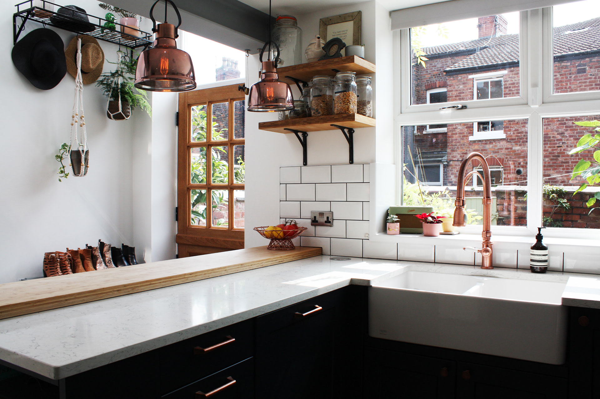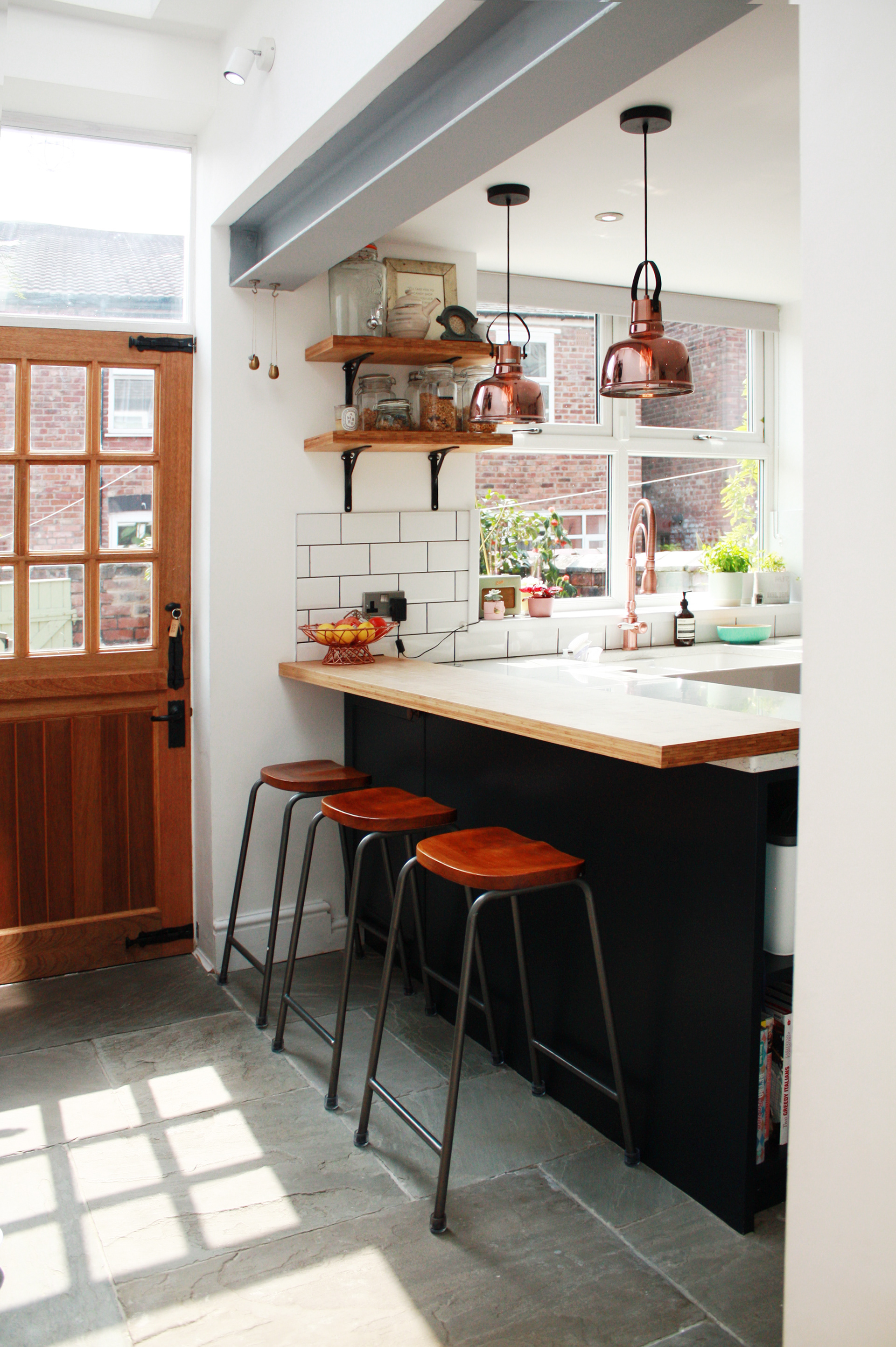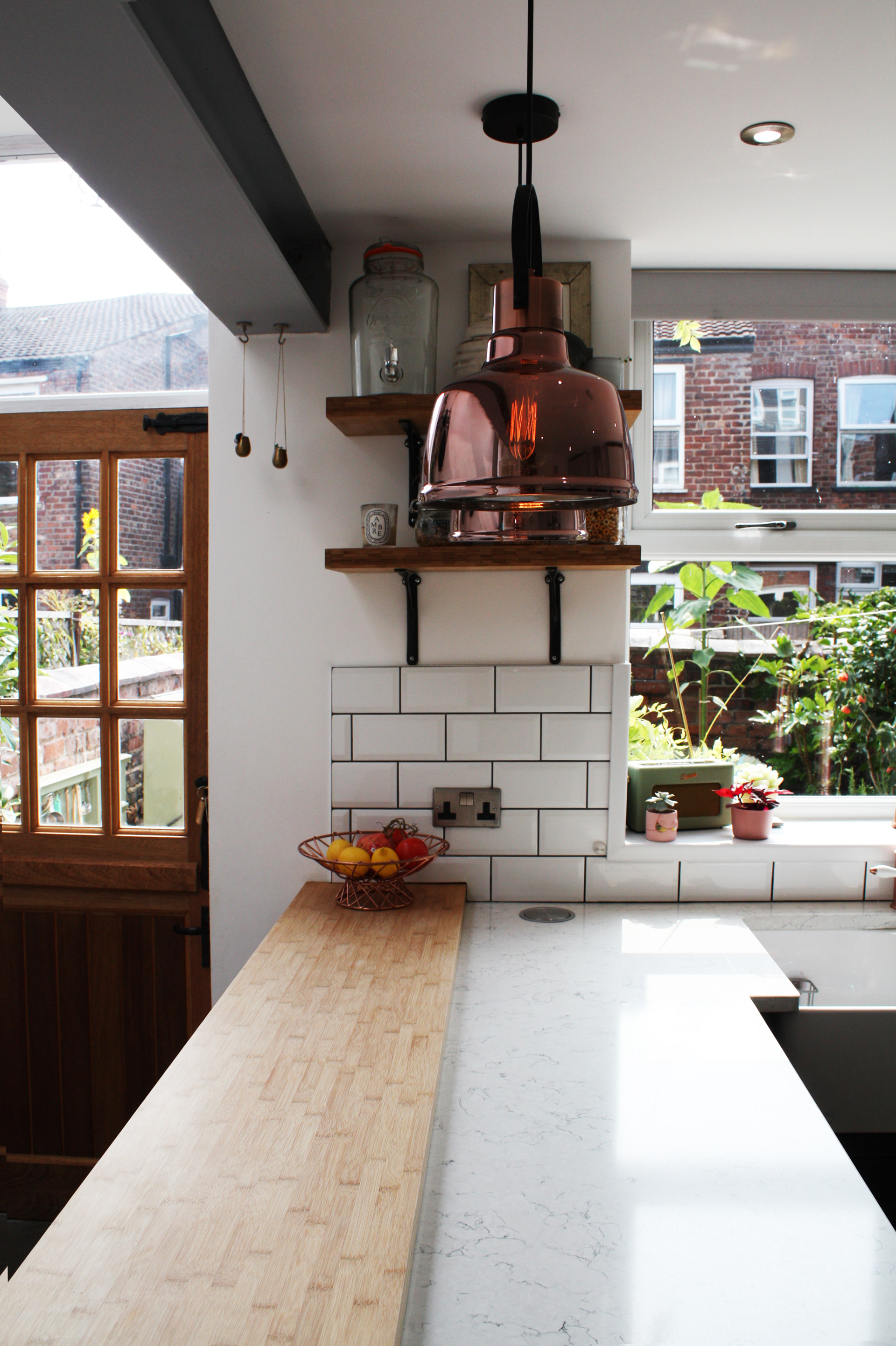 We pinched pockets of space in this Chorlton residence. Remodelling the back end of the ground floor we've designed in larger windows and roof lights allowing light to flood the space. This stunning contemporary kitchen has the perfect balance of natural earthy toned mixed with high gloss tiles and metallics. Using two toned kitchen unit's has allowed us to add colour into the kitchen without it being too overpowering.