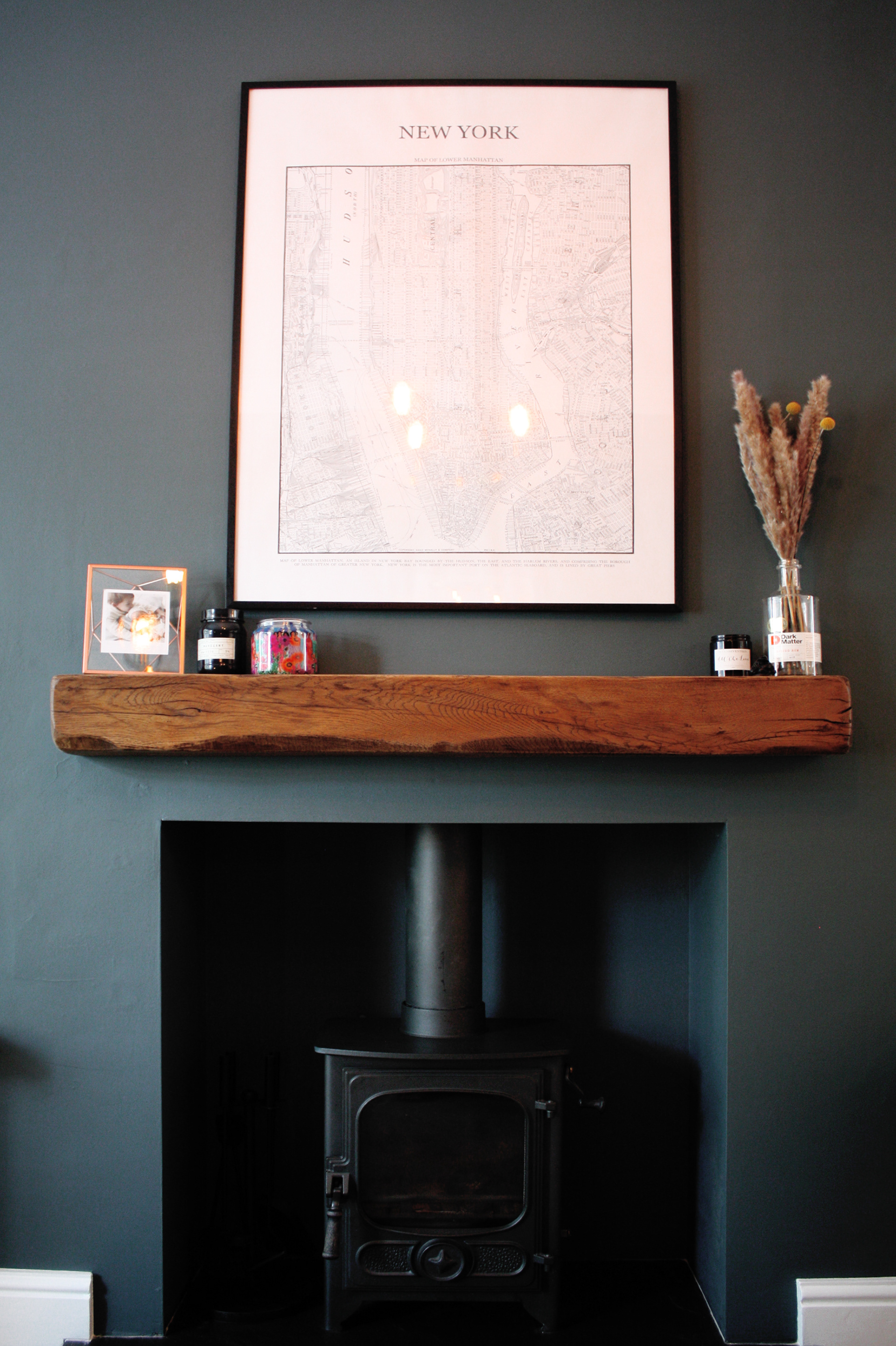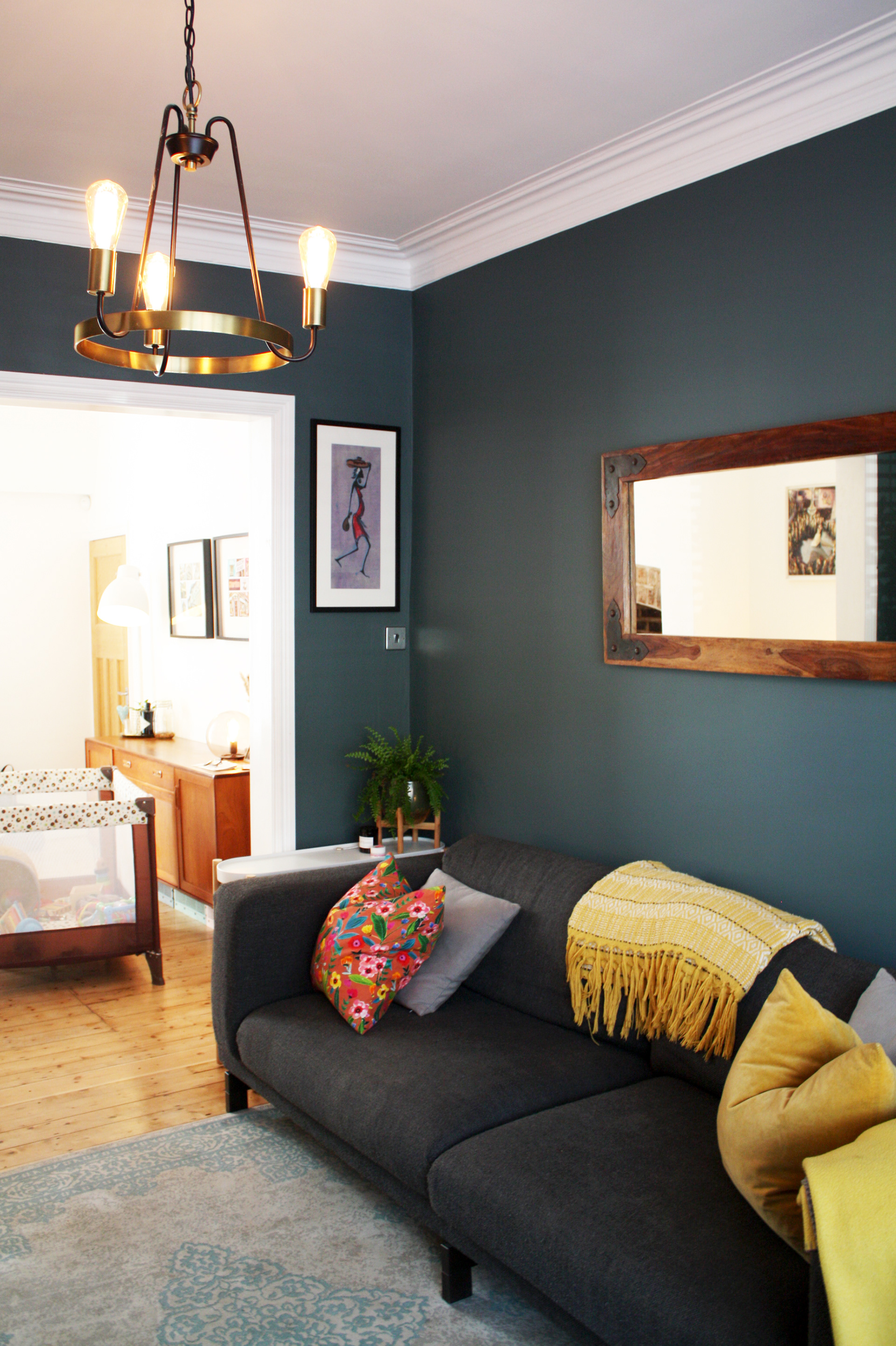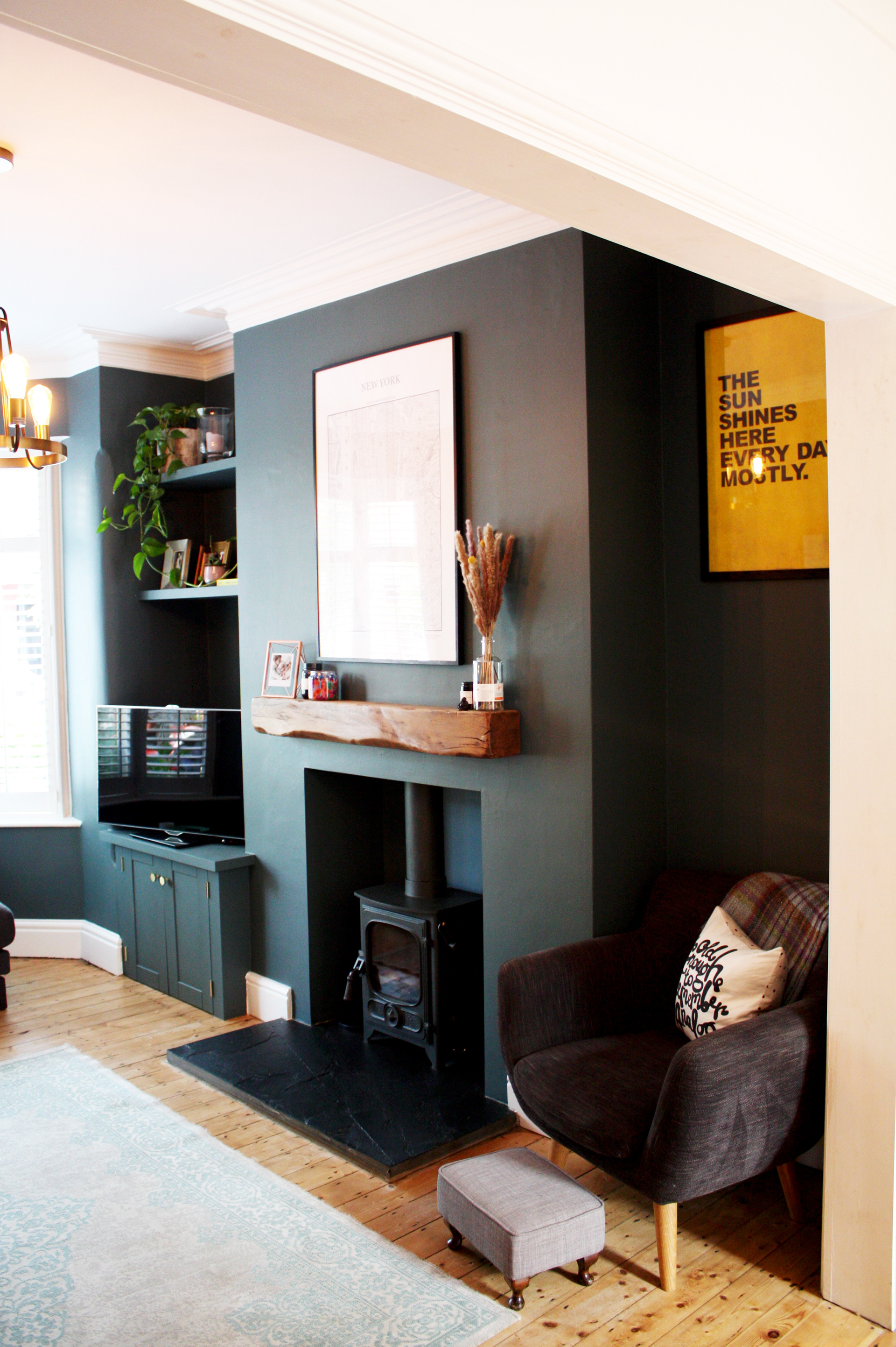 In the lounge made to measure carpentry slots into the alcove. The inky green to the walls helps to accentuate the white cornicing and architraves.