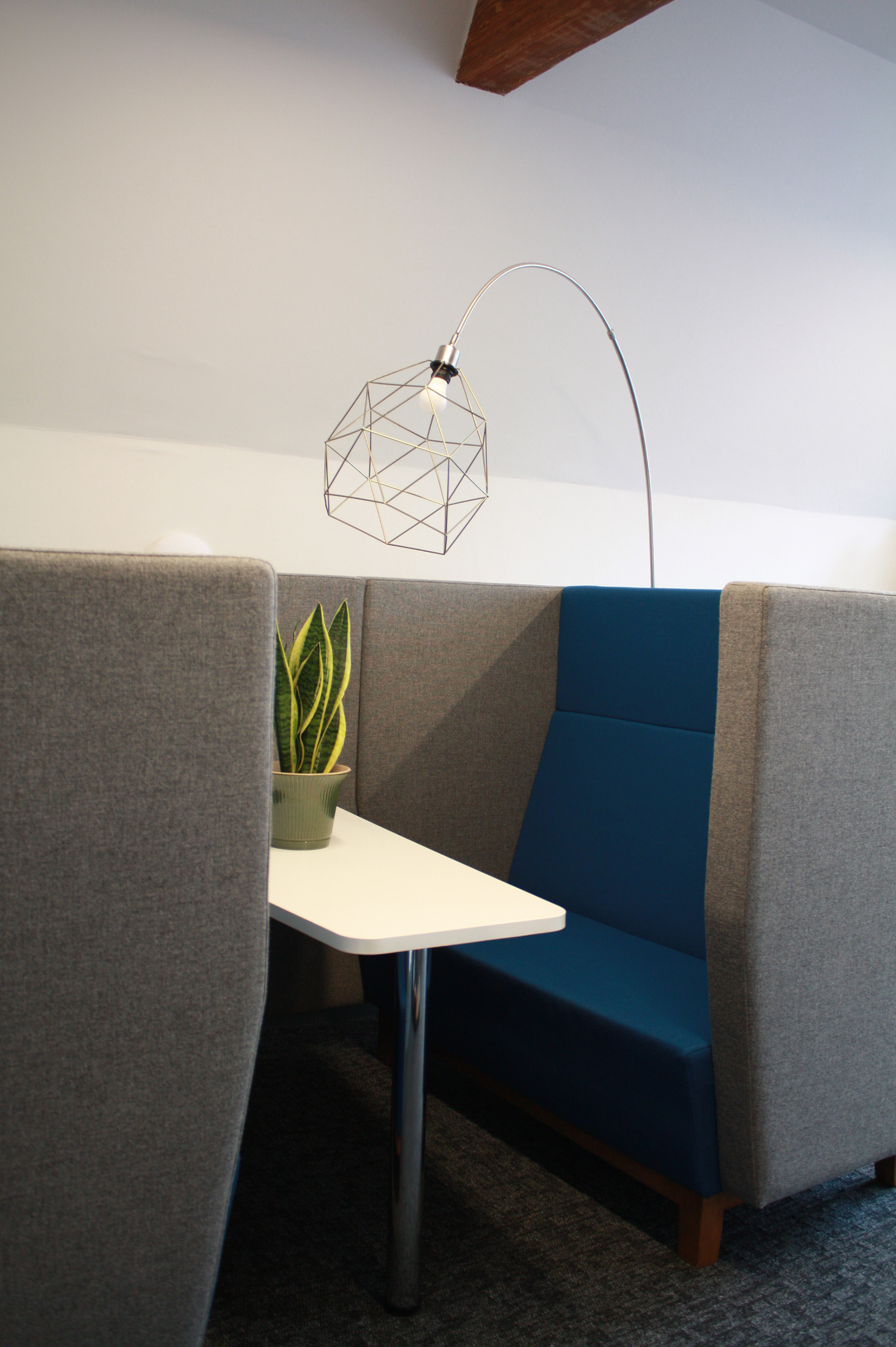 Space planning and floor plans to ensure we could maximise the number of desks. Booths and breakout seating for coffee breaks or collaborative work. Artwork with calming colours displayed playfully. Rich moody fabrics wrap around the feature seating. Flecks of metallic run through the furniture and accessories giving a subtle art deco theme. Large and small plants, palms, leafy trees and desktop succulents. The tactile plants within chunky pots soften corners, create focal points and decorate empty spaces. Simple signage to brand the space but not overpower.