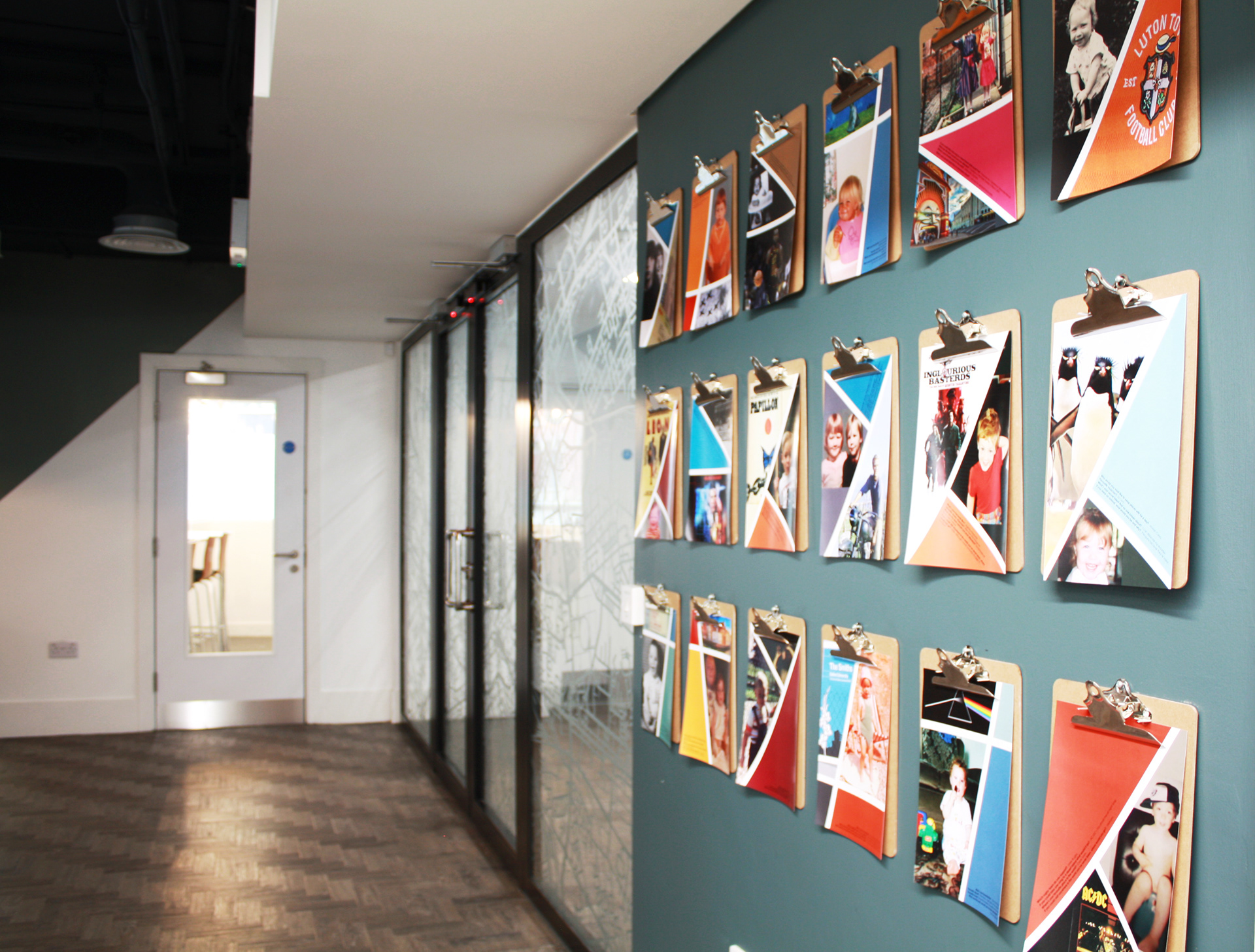 Working on the communal and break out areas of their new office we injected blasts of colour and artwork. The acoustics in the meetings room became compromised when large numbers were together. By printing onto acoustic absorbing panels we created a bespoke gallery wall and reduced the noise. As Avsion Young is a global company we wanted to brand the offices with a Manchester theme. We used iconic backdrops and incorporated famous poetry into this large scale backdrop. A Manchester map decal created privacy between the meeting rooms and communal areas. Vibrant, playful and fun ’about me’ slides were created for each member of staff.